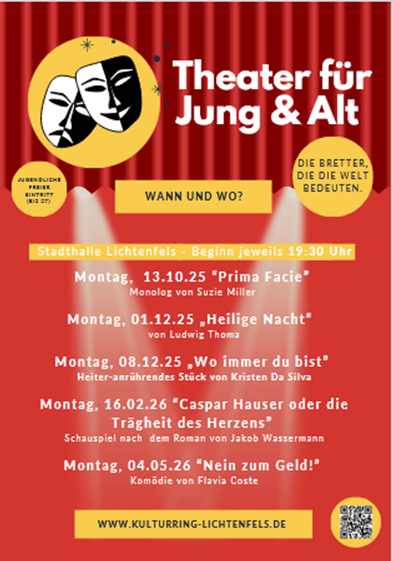 „Save the dates!“ (merk Dir schon mal die Termine!) heißt es wohl ausgehend von diesem spannenden Programm (nähere Informationen unter https://www.kulturring-lichtenfels.de/). Denn Vorfreude ist angesagt, wenn wieder die niveauvollen Aufführungen des Kulturrings Lichtenfels, die jeweils um 19.30 Uhr in der Stadthalle beginnen, auf die sicher wieder zahlreichen Zuschauer warten. Und wenn auch die heimischen Jugendlichen das Angebot eines kostenlosen Eintritts wieder umfassend wahrnehmen, wird es erneut lohnende und bereichernde Theaterabende in der Stadthalle geben.